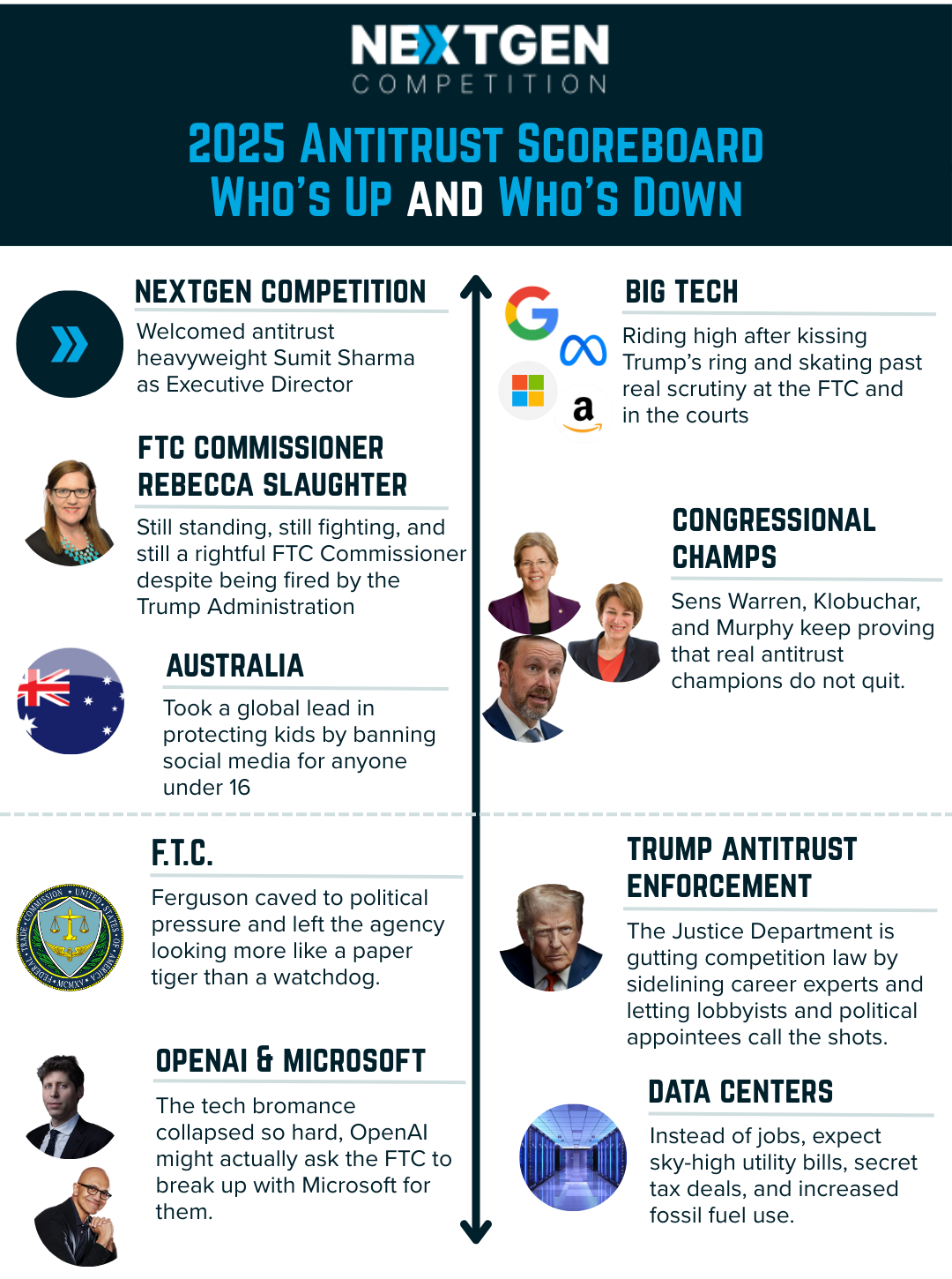 We began 2025 with a new presidential administration, one we were cautiously optimistic would continue to tighten the reins on monopolies. We were encouraged by AAG for Antitrust Gail Slater, for example, who we thought would continue the fight of her predecessor. Sadly, the year went from disappointment to disappointment, which led to a more active year than ever for NextGen as we called out the pandering for what it was: Big Tech flattery.