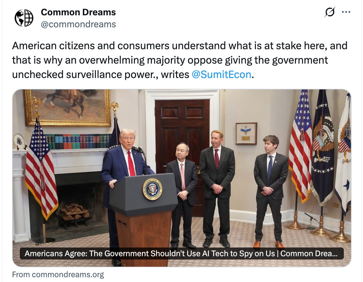 Three out of four Americans oppose giving the government unrestricted access to AI technology to surveil citizens, but Congress is asleep behind the wheel. In a new op-ed in Common Dreams, NextGen Competition Executive Director Sumit Sharma breaks down how OpenAI, Microsoft, and Amazon are enabling a domestic surveillance apparatus while hiding behind terms of service. Read it here.